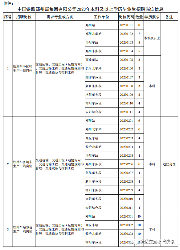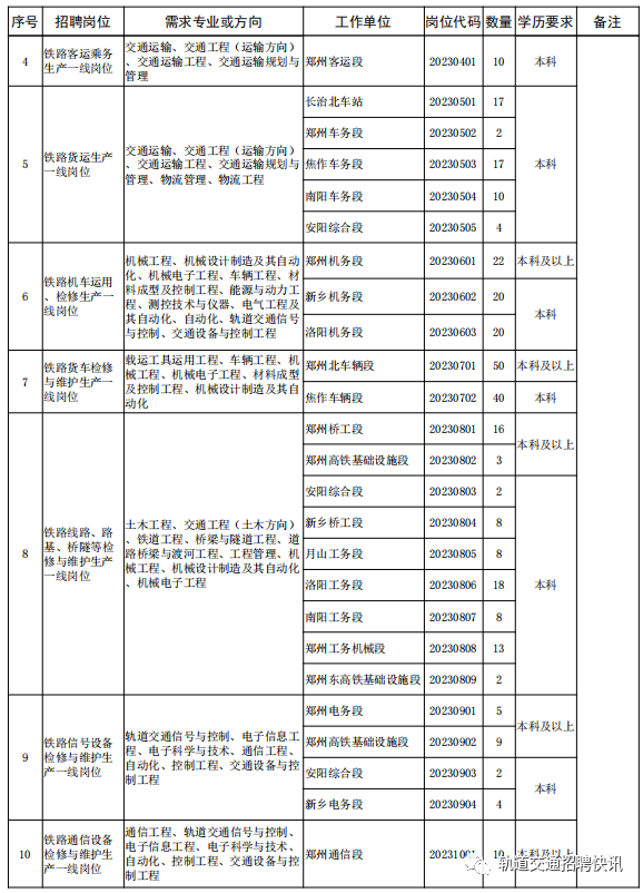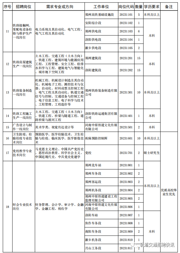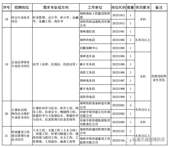 4.专业对口,成绩优良,符合招聘岗位要求的学历、专业等条件;其中序号为1-14号的岗位所学专业是铁路专业方向或所 学课程包含铁路专业课程的优先。